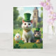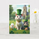 This greeting card shows a white cat seated at the center on an emerald lawn, wearing a green top hat with a tiny shamrock and a gold collar that catches the light. To the right, a tabby kitten peeks in close with a matching hat and a snug green scarf, its wide eyes turned toward the bigger cat in a tender, trusting way 💚. At their paws, a small hamster rests like a little tagalong friend, adding to the cozy group. On the left stands an egg-shaped character with a cheerful orange smile, rounding out the odd-but-charming lineup. Shamrocks are scattered through the grass, and behind them are leafy green trees and an old building with a tall steeple under soft clouds ☘️. The St. Patrick’s Day greeting appears along the top in green lettering, with a smaller line of text near the bottom in a lighter green. In the background, the building sits beyond the treeline, its steeple rising into a pale sky dotted with fluffy clouds.