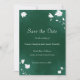 Emerald Wedding Watercolor floral Save the Date. This elegant design is beautiful and modern features white flowers and white text on a watercolor emerald background. If you need any help or advice, feel free to contact us. Be sure to visit the matching wedding collection in order to see more beautiful products of this wedding suite.