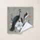 A striking black peacock surrounded by soft white and tan blossoms, accented with bold black leaves that echo its dramatic presence.
