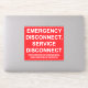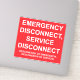 An EMERGENCY DISCONNECT, SERVICE DISCONNECT sticker label with Spanish subtitles for electricians to use to satisfy the requirements of article 230.85(E)(1) and (2) in the 2023 National Electrical Code. Desconexión de emergencia, desconexión del servicio