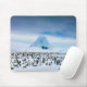 This photo features an emperor penguin colony with frozen icebergs as a backdrop.