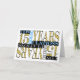 This is an employee 15 years anniversary card in blue, grey, yellow, black and white. The text 'CONGRATULATIONS' and years '15 YEARS' are laid out in a geometric mosaic fashion, creating an interesting design of shapes and colours.