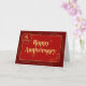 This is a red and burgundy employee 4th anniversary card featuring the text 'Happy Anniversary' within a centrally placed red, rectangular shape with gold foil effect border, and written in a gorgeous serif font with attractive flourishes and a matching gold foil effect overlay.