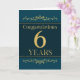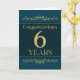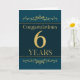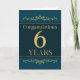 This is an employee 6th anniversary card. The design is formal and elegant and set against a jade coloured background with gold foil effect text and decorative elements.