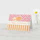 A fun, colourful ten years employee anniversary card with a bold summer fresh vibe. There is a large pink polka dots on white pattern in the top half; some of the polka dots have a gold sparkle effect overlay, and a bold, orange and white vertical stripes pattern, with the addition of decorative interspersed thin gold sparkle effect vertical lines, in the bottom half.