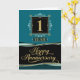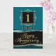 The design has been created within a jade colour scheme and features the number 1, centre top, in a decorative text box. The number is written in an elegantly curved font with a digitally created gold foil effect overlay against a black background. Underneath the number is the word 'YEAR', in a matching font and overlay to the number, and set against a dark jade background. In the lower section of the design, on a gently curved, multi-bordered text box, is the text 'Happy Anniversary', written in a beautifully flowing, script style font, with decorative swashes. This text too has a digitally created, gold foil effect, overlay and is set against a black background.