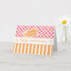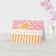 A fun, colourful four years employee anniversary card with a bold summer fresh vibe. There is a large pink polka dots on white pattern in the top half; some of the polka dots have a gold sparkle effect overlay, and a bold, orange and white vertical stripes pattern, with the addition of decorative interspersed thin gold sparkle effect vertical lines, in the bottom half.