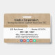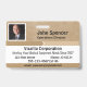 Horizontal Employee ID badge with two shades of beige plus mottled beige background. All elements are changable or removable. Front of Badge Elements include: employee photo, employee name, employee department, company name and tagline. company address, phone number and extension, and email addresses. Back of design also has company info which is all customizable plus social media icons. Also available in vertical orientation. Slot at top for lanyard. All of these elements can be changed or deleted.
