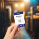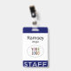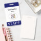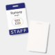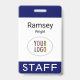 Personalize this employee name badge with your company logo, employee name, or other custom text. It's pvc plastic and available with a metal clip, lanyard, or a retractable reel. This is a navy blue name badge with a modern minimalist design. You can easily customize the colours, fonts, and design and optionally add content to the back. No minimum order quantity and no setup fee.