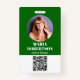 This design features an employee photo badge, perfect for any company, great for corporate security, with name and title, a simple business minimalist name badge with a QR code scan, a minimalist business employee photo perfect staff keychain, in green and white