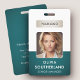 A modern and elegant corporate ID badge designed in a deep green colour palette. Easily customizable with an employee photo, name, job title, company logo, and other business details. The layout features clean typography for a professional and clear appearance, ensuring easy identification. This ID badge is available with options for a lanyard, metal clip, or retractable holder. No minimum order required.