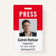 Personalize these vertical press pass badges with an employee photo and name, along with three lines of additional custom text for title or role, media outlet, and valid through date. PRESS appears at the top in bold white lettering. Additional custom text field located on the back for return information or other details, as well as a template for a barcode or a QR code.