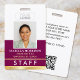 Create a professional appearance with this personalized staff identification badge. A simple and stylish template with your ID photo, name, job title, employee number, company logo, and scannable QR code. All the text can be customized or deleted to suit your business needs. This elegant design would suit many different workplaces and professions, including retail salespersons, restaurant and foodservice employees, office staff, small businesses, conference name tags and more! Printed colours: deep purple-pink plum and white with a gold gradient.