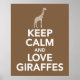 C'est un grand tirage pour l'amoureux de la girafe. Il présente une silhouette de girafe sur un arrière - plan marron. Le tirage dit "Gardez le calme et aimez les girafes" qui est un jeu sur le libellé des affiches de 2ÈME GUERRE MONDIALE populaires Garder le calme.