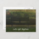 An image of the back of an empty bench in front of a raised garden at night with white text that reads, Let's get together.
