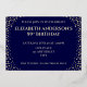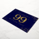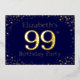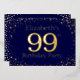 99e anniversaire invitation de fête. Personnalisez avec le nom de la personne d'honneur. Le numéro 99 en gros style scintillant. Encadré de points dorés en chute. Placé sur un bleu foncé très saturé. Entrez les détails de la fête au verso de l'invitation en utilisant les modèles, également envoyé sur bleu foncé encadré de diamants.