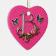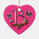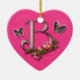 Lettre B de monogramme avec rose et papillons sur un ornement de forme de coeur.