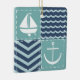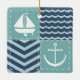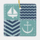 Un motif de carrés turquoise orageux, décoré d'un voilier et d'une ancre blancs, et de carrés bleu marine, accentués de chevrons et de vagues bleu pâle, est accentué par la couture blanche pour créer une atmosphère nautique classique.