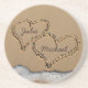 Dessous de verre personnalisés de thème de plage, avec deux coeurs dessinés dans le sable. Écrivez vos noms dans l'espace fourni