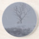 Paysage 3D froid et venteux en hiver, créé en Vue. Sur le sommet d'une colline blanche avec glace et neige, contre un ciel gris orageux avec pluie ou sommeil tombant régulièrement, un érablière nu et solitaire se dresse sous un banc en bois.