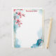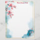 Des fleurs de cerisiers roses dans les coins supérieur gauche et inférieur droit d'un cadre doré, sur un arrière - plan d'aquarelle bleu et blanc rendent cette papeterie parfaite pour votre correspondance, newsletters ou invitations. Beau thème d'inspiration asiatique.