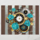 Patterned, antique watch, adorned with jewelry, gold hour hands and Latin numerals with turquoise roses on brown, striped background. Steampunk style.