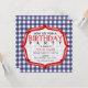 Une invitation à la fête d'anniversaire avec un arrière - plan bleu en vichy devant et derrière. Personnalisez le texte dans le cadre rouge avec les détails de votre événement. Recherchez les objets correspondants chez Jill's Paperie.