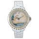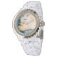 This enamel and rhinestone watch is designed with my photo of an amber-coloured Persian on a blue floral bedspread.
