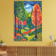 A vibrant linocut print in a folk art style inspired by Marc Chagall, depicting a whimsical forest scene.  Fantastical trees, vibrant colours, and playful details evoke a sense of magic and wonder.