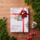 This magical and whimsical gift wrapping paper features an enchanted forest theme. An image of a fairy door in a little mushroom garden is placed at the bottom, with a fairy fluttering above it. Various flowers and mushrooms are placed along the bottom. The background is a faded purple pattern. A sample name and Happy Birthday greeting are printed above the fairy garden, which you can personalize to include your own custom name or text.