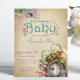 This magical and whimsical baby shower invitation features an enchanted forest theme. An image of a fairy door in a little mushroom garden is placed at the bottom, with a fairy fluttering above it. The background is a vintage style, faded parchment paper pattern.