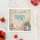 These magical and whimsical baby shower napkins feature an enchanted forest theme. An image of a fairy door in a little mushroom garden is placed at the bottom, with a fairy fluttering above it. Various flowers and mushrooms are placed along the bottom. The background is a vintage style, faded parchment paper pattern.