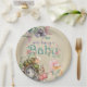 These magical and whimsical baby shower plates feature an enchanted forest theme. An image of a fairy door in a little mushroom garden is placed at the bottom, with a fairy fluttering above it. The background is a vintage style, faded parchment paper pattern.