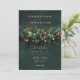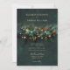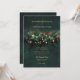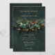 An illustration of wild flowers, branches and foliage in a botanical wreath arrangement with gold accents and fairy lights (these are digital effects!), over a glittering emerald green background, decorates this spring summer fall and winter wedding invitation with an enchanted forest wedding theme. An elegant, modern invitation for a fairytale wedding, it is the perfect wedding invitation for brides who love the fairytale forest setting, the fairy forest or fairy garden theme and emerald green with gold accents. The modern and simple wedding typography is sprinkled with classic wedding calligraphy accents for an elegant touch.