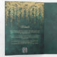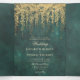 An illustration of tree branches with lush, wild greenery and hanging foliage, layered digitally with gold, over a glittering emerald green background, decorates this spring summer all in one wedding invitation with an enchanted forest theme. An elegant, modern invitation for a fairytale wedding, it is the perfect trifold wedding invitation that includes ample space for all your wedding information, including gifting and a short timeline of the day, as well as a photo. Simply fold, seal and send. Perfect for brides who love the fairytale forest setting, the fairy forest or fairy garden theme and emerald green.