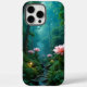 A serene forest scene with towering trees and a gentle stream flowing through, surrounded by lush green foliage. Large, radiant pink lotus flowers bloom along the path, casting a magical glow under soft lighting, creating an enchanting, dreamlike atmosphere