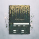 A whimsical illustration of lush hanging vines layered with gold (digital effect, not real foil!) over a sparkling emerald green watercolor background, sparkling with fairy lights and magic dust, decorates this winter spring summer fall wedding RSVP card with an enchanted forest theme. An elegant, modern reply card for a fairytale wedding. Perfect for brides who love the fairytale forest setting, the fairy forest or fairy garden theme and emerald green, mauve and gold.