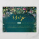 A whimsical watercolor illustration of lush foliage in emerald green and mauve and purple, sparkling bright with fairy lights and magic dust, decorates this spring summer fall Sweet 16 RSVP card with an enchanted forest theme that also features a frame of delicate roses in pink, purple and mauve. The text, as well as the title, were produced with real gold foil. An elegant, modern invitation for a fairytale sixteenth birthday. Perfect for girls and families who love the fairytale forest setting, the fairy forest or fairy garden theme and emerald green, mauve and gold.