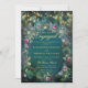 This enchanted forest wedding engagement party invitation features lush, wild greenery, hanging foliage, and tree branches draped with fairy lights in a faux gold effect, creating a romantic, magical atmosphere. A frame of fuchsia pink, purple, and cream roses adds a luxurious floral touch, while the glittering emerald green background enhances the mystical, fairytale aesthetic. Perfect for a spring, summer, fall, or winter wedding, this elegant, modern engagement party invitation is ideal for brides who adore a fairy forest setting, woodland weddings, fairy garden themes, romantic rose designs, and a colour palette of emerald green and gold. Whether you're planning a mystical fairytale wedding, a botanical-inspired ceremony, or a whimsical woodland celebration, this luxurious floral engagement party invitation captures the magic of a dreamy forest wedding.