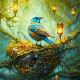 A magical illustration of a bright blue bird perched on a nest among mystical glowing lanterns and lush greenery within an enchanted forest, evoking a serene and whimsical ambiance. Perfect for families and friends.
