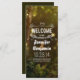 Wedding program with string lights hanging of the trees of the enchanted forest