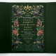 Elegant and gothic wedding design with ravens, red snapdragons, and dahlias against a dark green background. PLEASE NOTE: the gold featured on this invite is NOT real foil. Matching Items in our shop for a complete party theme.