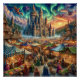 The scene is set in a medieval marketplace at the foot of a grand castle, with vendors selling goods under colorful tents as townsfolk in period attire mingle and barter. Majestic dragons soar in the sky above, adding a fantastical element to the bustling market scene. The atmosphere is further enchanted by an ethereal glow, possibly from the northern lights, casting a magical light over the entire landscape and highlighting the intricate architecture of the castle.