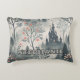 This fantastical scene throw pillow features a dark, towering castle with glowing windows nestled in a misty forest of blue and grey tones. Surrounded by slender evergreens, bare-branched trees, and soft blossoms in pink and orange, the landscape shimmers with subtle specks of magical light. The twilight ambiance and ethereal details create a whimsical, mysterious atmosphere, perfect for lovers of fantasy, fairytales, and dreamlike forest settings.