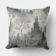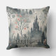 This fantastical scene throw pillow features a dark, towering castle with glowing windows nestled in a misty forest of blue and grey tones. Surrounded by slender evergreens, bare-branched trees, and soft blossoms in pink and orange, the landscape shimmers with subtle specks of magical light. The twilight ambiance and ethereal details create a whimsical, mysterious atmosphere, perfect for lovers of fantasy, fairytales, and dreamlike forest settings.