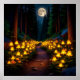A serene evening forest path houses glowing flowers under the moonlight, creating an enchanting atmosphere full of tranquillity and magic.