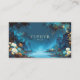 Define your brand with the magical elegance and celestial mystery of an enchanted realm using this captivating business card. The design centers on a spectacular nocturnal waterscape, dominated by a wide, calm lake reflecting the blue twilight sky. The background features dark, towering rock formations and ancient trees under a deep, starry midnight blue and teal atmosphere, with a faint celestial body glowing on the horizon. The entire scene is lavishly framed by lush golden yellow and creamy white flowers and dark leafy vines that glow with subtle starlight, creating a vibrant, romantic border. A clean, thin metallic gold rectangular frame defines the space for your information. This artwork blends cinematic, magical realism with opulent, sophisticated florals, making your card truly unforgettable. This business card is ideally suited for a high-end event stylist specializing in fantasy or twilight-themed galas, a boutique travel agency promoting exclusive, hidden destinations, or a fine art photographer showcasing mystical water scenes. It would also perfectly suit a fantasy novelist or game developer seeking distinctive, narrative-driven branding, or a luxury hotelier wanting to convey a magical, serene setting.
