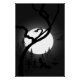 Enchanted forest Halloween night, a black and grey silhouette painting with flying bats and a snake in the tree view