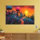 This vibrant and fantastical artwork portrays a magical village nestled on a hillside under a breathtaking sunset. A glowing full moon or sun, radiating warmth, dominates the fiery orange and red sky, studded with twinkling stars. A winding, reddish path meanders through a riot of colourful wildflowers and grasses in shades of blue, purple, and pink. Traditional-style houses with glowing windows dot the landscape, leading up to a cluster of homes at the crest. Strikingly coloured trees, including a prominent electric blue and a vivid fuchsia, add to the whimsical and surreal atmosphere of this dreamlike scene.