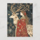 The image depicts an enchanting scene featuring a woman dressed in an ornate, crimson cloak adorned with golden patterns. Her long brown hair is elegantly styled, with floral and ribbon accents. She is gently touching a deer with intricate, branching antlers, decorated with ornaments. Snowflakes and starry patterns surround them, evoking a magical, wintery atmosphere. The artwork blends a mystical, fairytale-like charm with a holiday season ambiance, featuring a delicate, illustrative style.